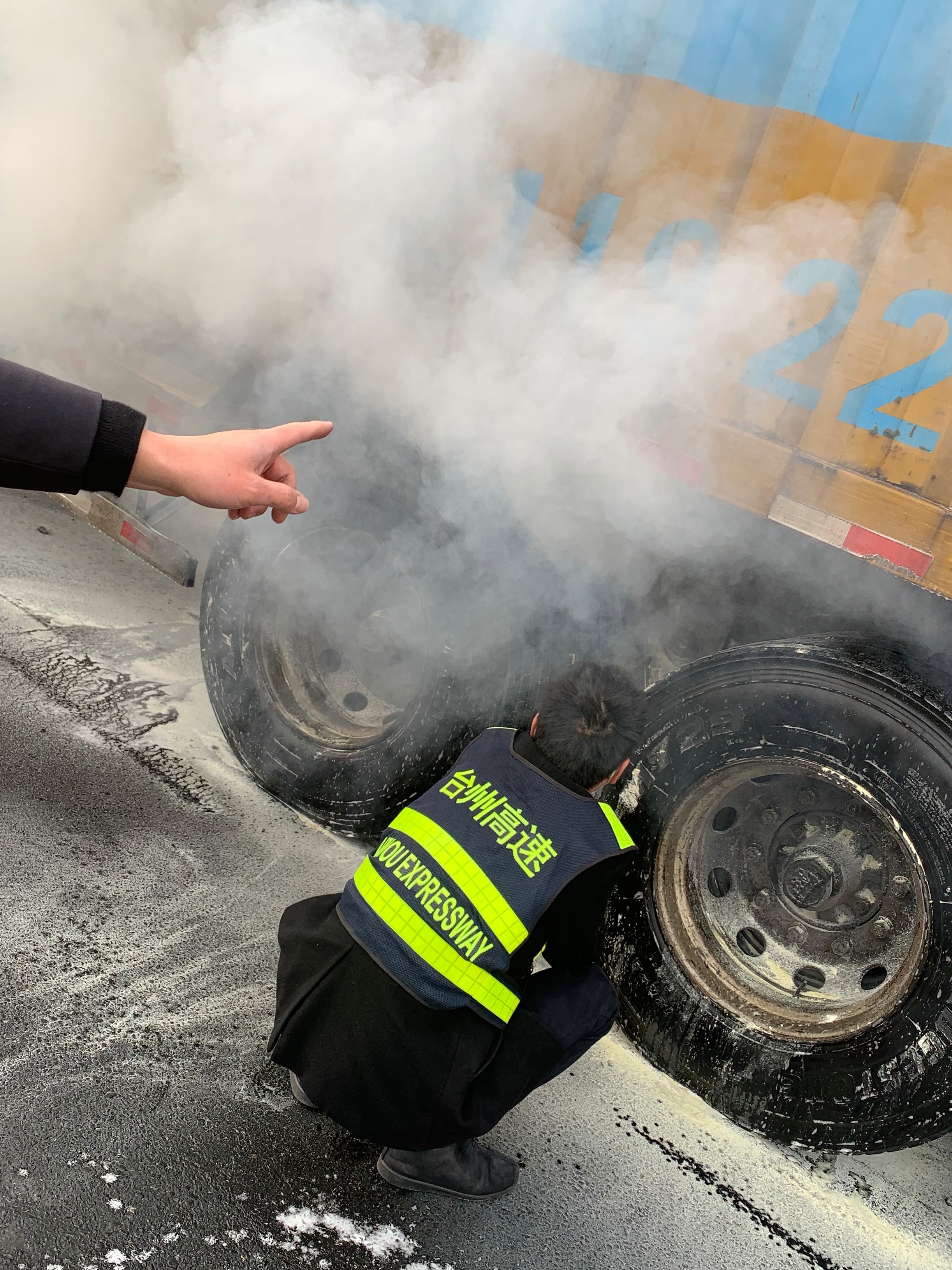 “嘭……”3月5日早上7:35分左右,臺(tái)州收費(fèi)所傳來(lái)一聲巨響,一輛車牌“閩”字開(kāi)頭的大貨車緩緩駛來(lái),其車廂后輪胎正冒火光,隨之白煙滾滾升起,駕駛員卻渾然不知,一路行駛。
