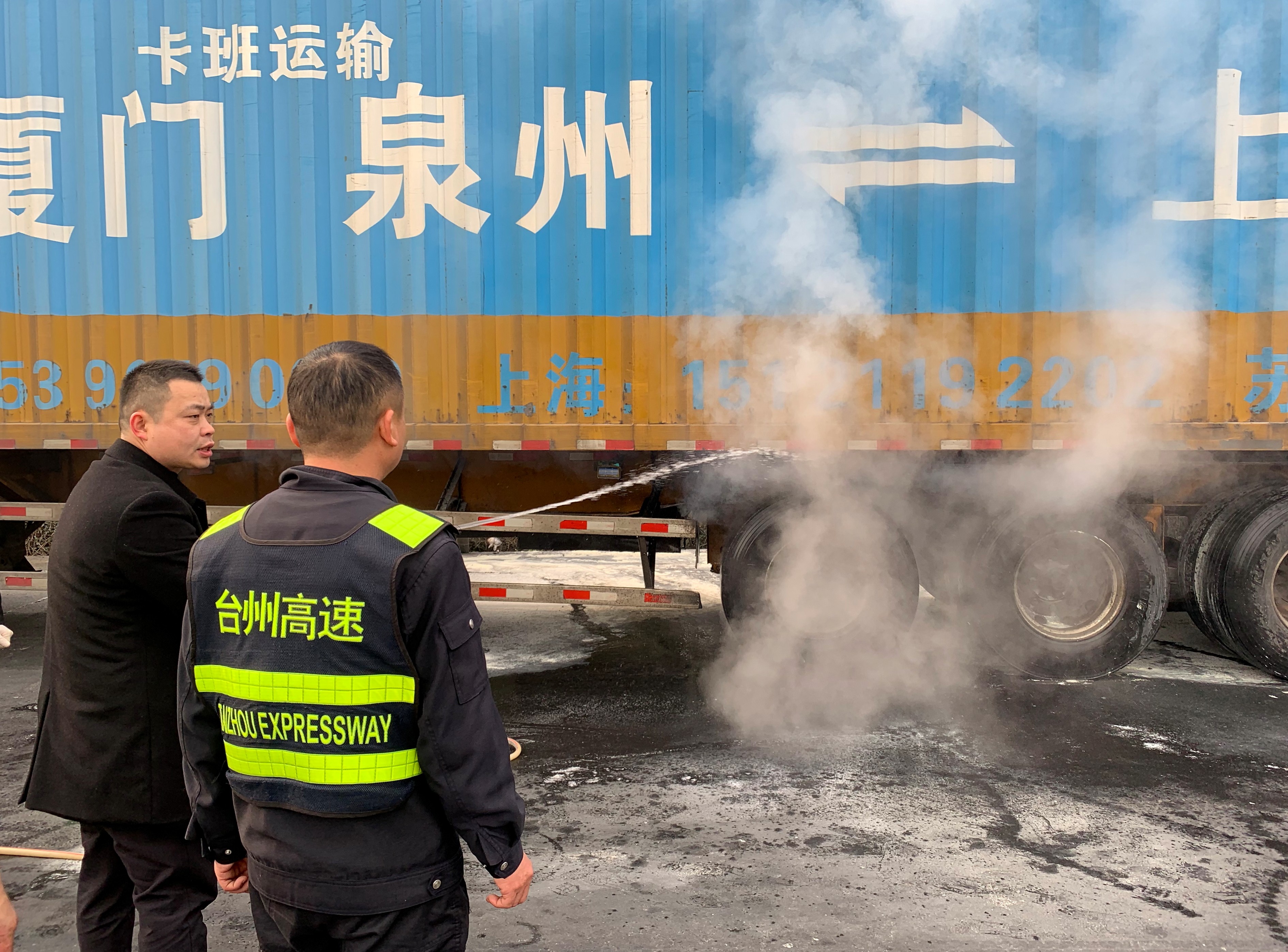 (圖為工作人員奮力救火) 就在這時(shí),突然又一聲巨響, 貨車輪胎發(fā)生二次爆炸,火苗再次復(fù)燃。但大家絲毫不畏懼,提起滅火器對(duì)準(zhǔn)著火點(diǎn),快準(zhǔn)狠,火苗再次被撲滅。現(xiàn)場(chǎng),輪胎處還冒著白煙,監(jiān)控中心何先林提議利用車道上的兩根水管的水對(duì)車輛輪胎進(jìn)行沖水降溫,避免再次發(fā)生爆炸。 經(jīng)過(guò)長(zhǎng)達(dá)半小時(shí)的緊急救援,火勢(shì)終于得到控制,無(wú)人員傷亡,車輛也沒(méi)有造成損失。據(jù)了解,該車起火原因是輪胎上有鐵絲,摩擦產(chǎn)熱導(dǎo)致輪胎爆炸起火。 “太感謝了,全靠你們發(fā)現(xiàn),及時(shí)止損,不然車就燒沒(méi)了。”駕駛員連聲道謝。 在此提醒廣大司乘人員,上高速前務(wù)必要對(duì)車輛進(jìn)行全面檢查,特別是輪胎、剎車等重要部位,避免行車途中發(fā)生故障導(dǎo)致嚴(yán)重后果。 任青青
