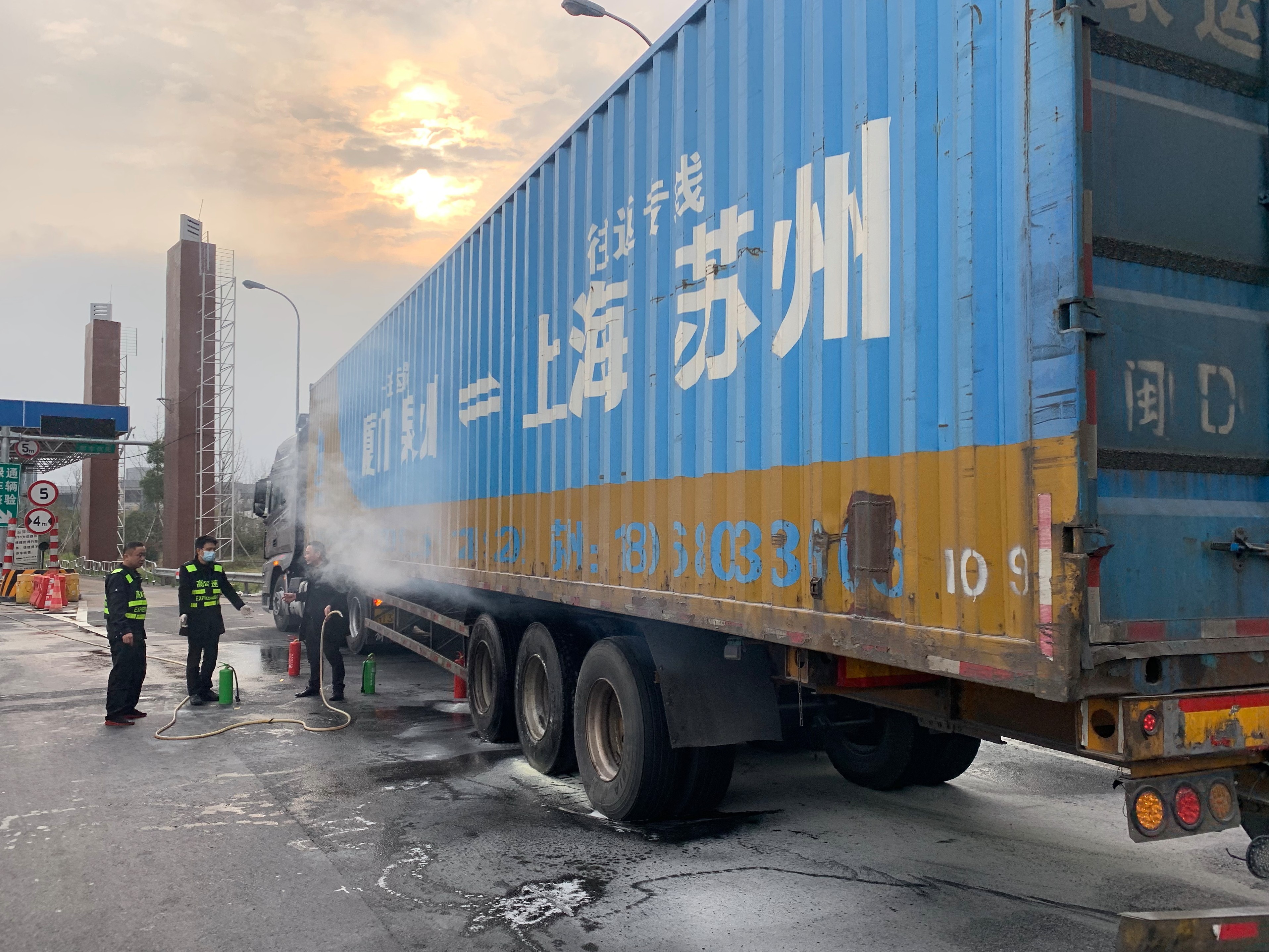 “停車,停車,輪胎起火了。”收費(fèi)員盧靜對(duì)著貨車不停搖手,喊話,貨車駕駛員這才發(fā)現(xiàn)情況,在內(nèi)廣場(chǎng)附近停下來(lái)。 時(shí)間就是生命,時(shí)間就是速度,當(dāng)班班長(zhǎng)張錚,副班長(zhǎng)黃智超和收費(fèi)員鐘鴻廣第一時(shí)間拿起崗?fù)ね獾臏缁鹌鞅枷蚱鸹疖囕v。大家齊心協(xié)力,火苗瞬間被壓了下去。