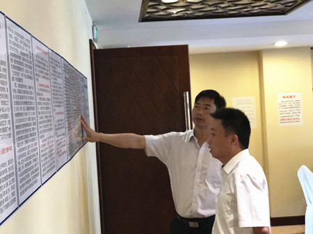 圖為集團(tuán)副總經(jīng)理陳保衛(wèi)正在檢查標(biāo)語標(biāo)識 陳保衛(wèi)認(rèn)真查看了仙居收購點(diǎn)從入口到辦理點(diǎn)的指示標(biāo)牌,并向工作人員詢問了該收購點(diǎn)所在酒店的知名度。經(jīng)工作人員介紹,仙居?xùn)|方大酒店是仙居當(dāng)?shù)厝朔浅J煜さ木频辏€未發(fā)生過股東找不到收購點(diǎn)而打電話詢問的事。陳保衛(wèi)聽后面帶微笑,連連點(diǎn)頭。 走到收購點(diǎn)內(nèi),員工正在給幾名股東辦理咨詢業(yè)務(wù),陳保衛(wèi)轉(zhuǎn)身查看起收購點(diǎn)內(nèi)等待區(qū)、標(biāo)語標(biāo)識等布置。當(dāng)看到貼在墻上的“市國資委主任徐豪就臺州高速股權(quán)集中和優(yōu)化的有關(guān)問題接收臺州各大媒體的采訪提問”內(nèi)容時,陳保衛(wèi)認(rèn)為該招貼畫制作簡潔、一目了然,可以較好地展示公司形象,回答股東疑問。他要求收購點(diǎn)工作人員再接再厲、主動作為,以熱情飽滿的服務(wù)態(tài)度,貫徹落實(shí)好各項(xiàng)工作部署,共同努力完成股權(quán)集中和優(yōu)化工作。 眼下,該收購點(diǎn)股權(quán)集中和優(yōu)化工作已步入正軌,各項(xiàng)工作運(yùn)行平穩(wěn)正常,當(dāng)前正在為9月8日仙居縣國有資產(chǎn)投資集團(tuán)有限公司第一個轉(zhuǎn)讓股權(quán)宣傳事宜進(jìn)行多方協(xié)調(diào)。 張波