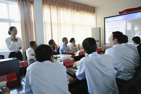 圖為培訓師講解實際培訓中的文明服務技巧