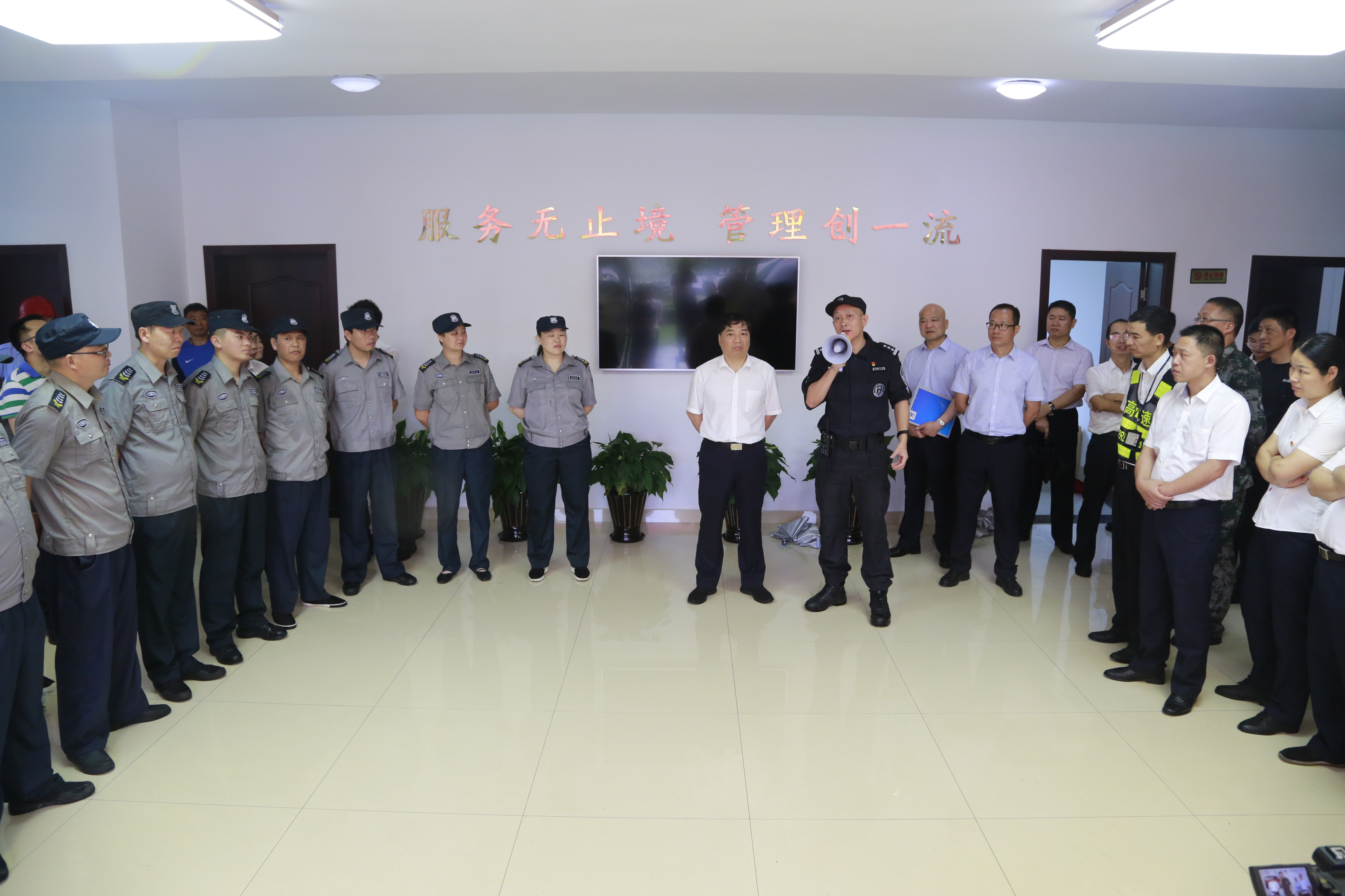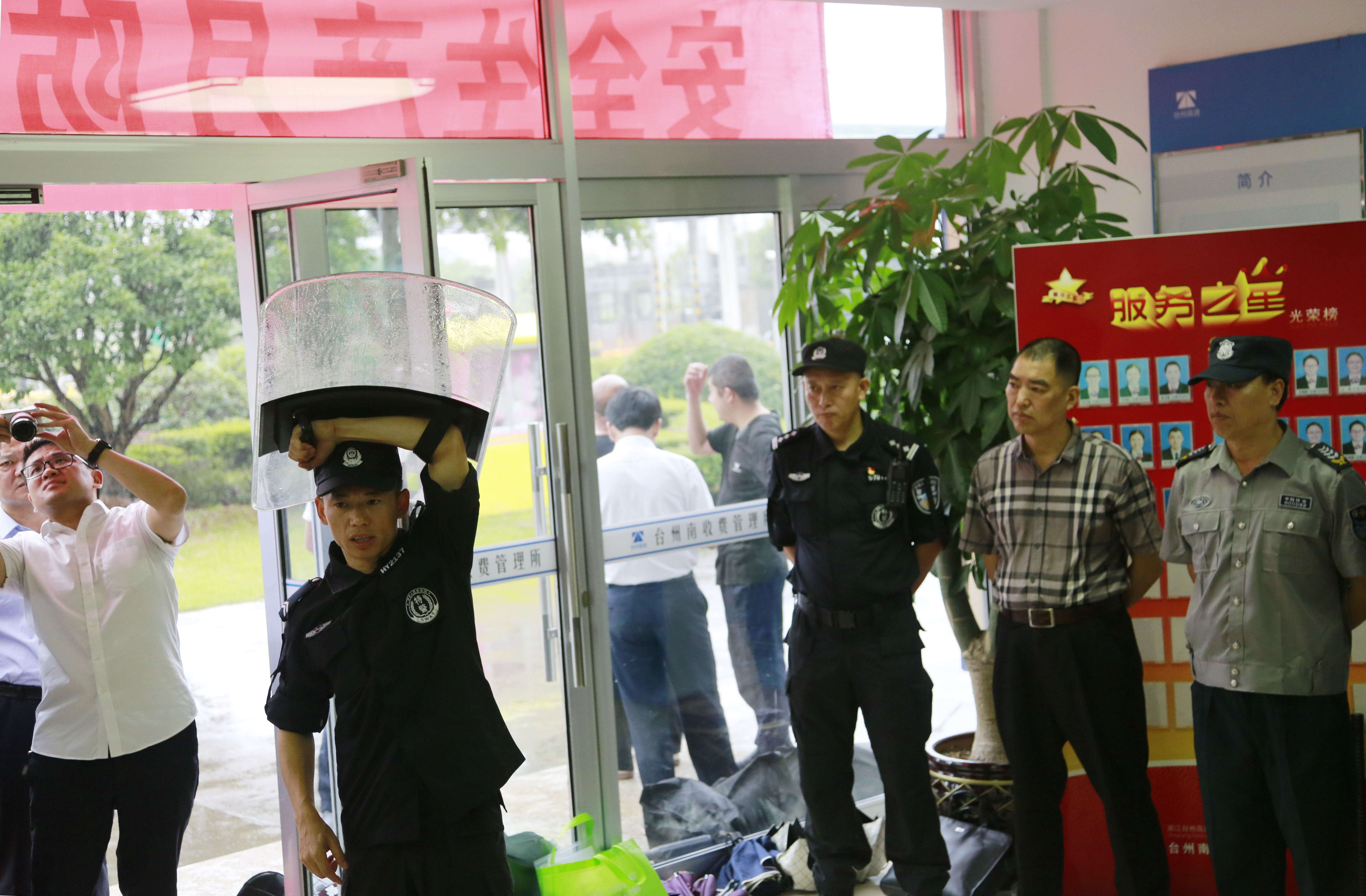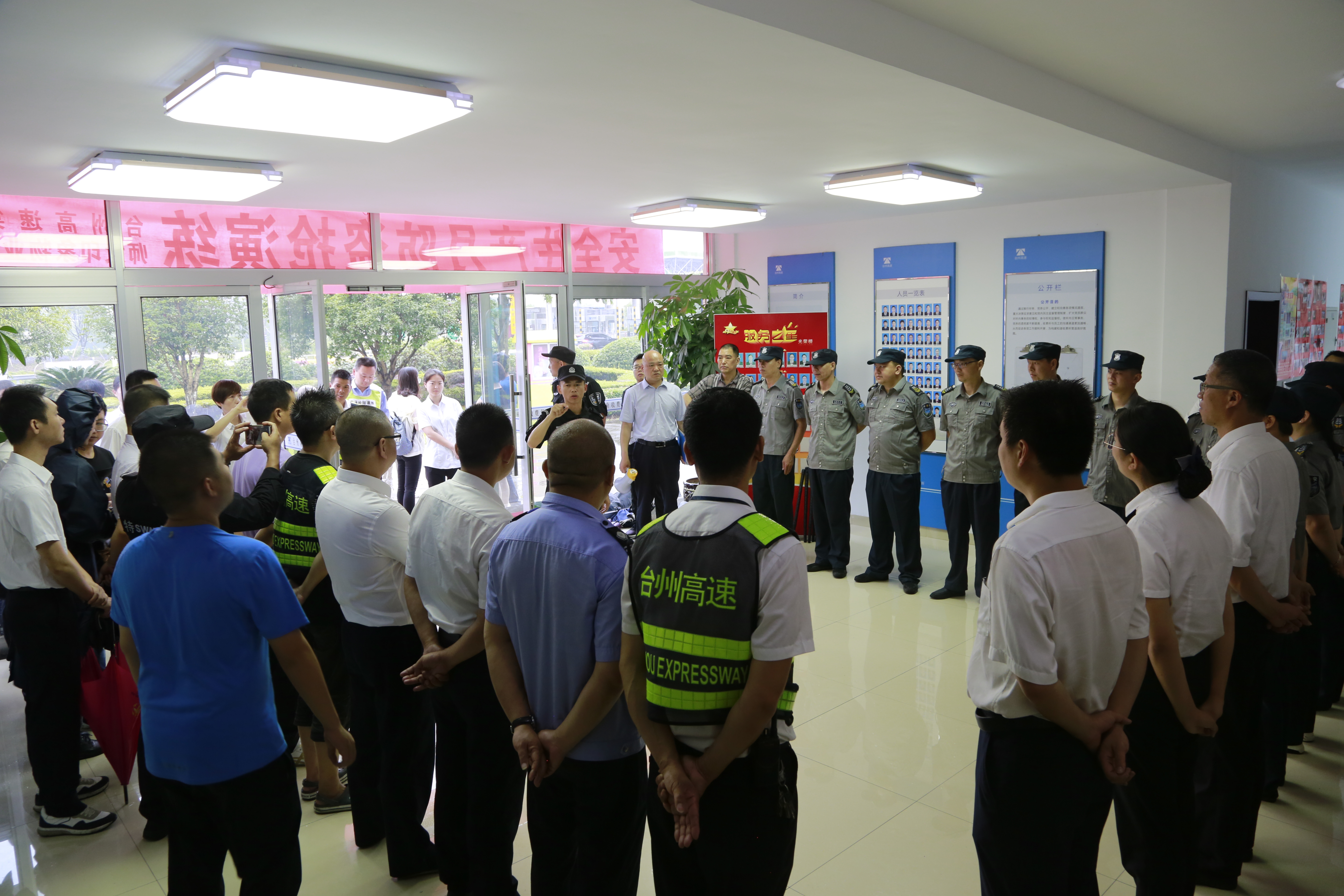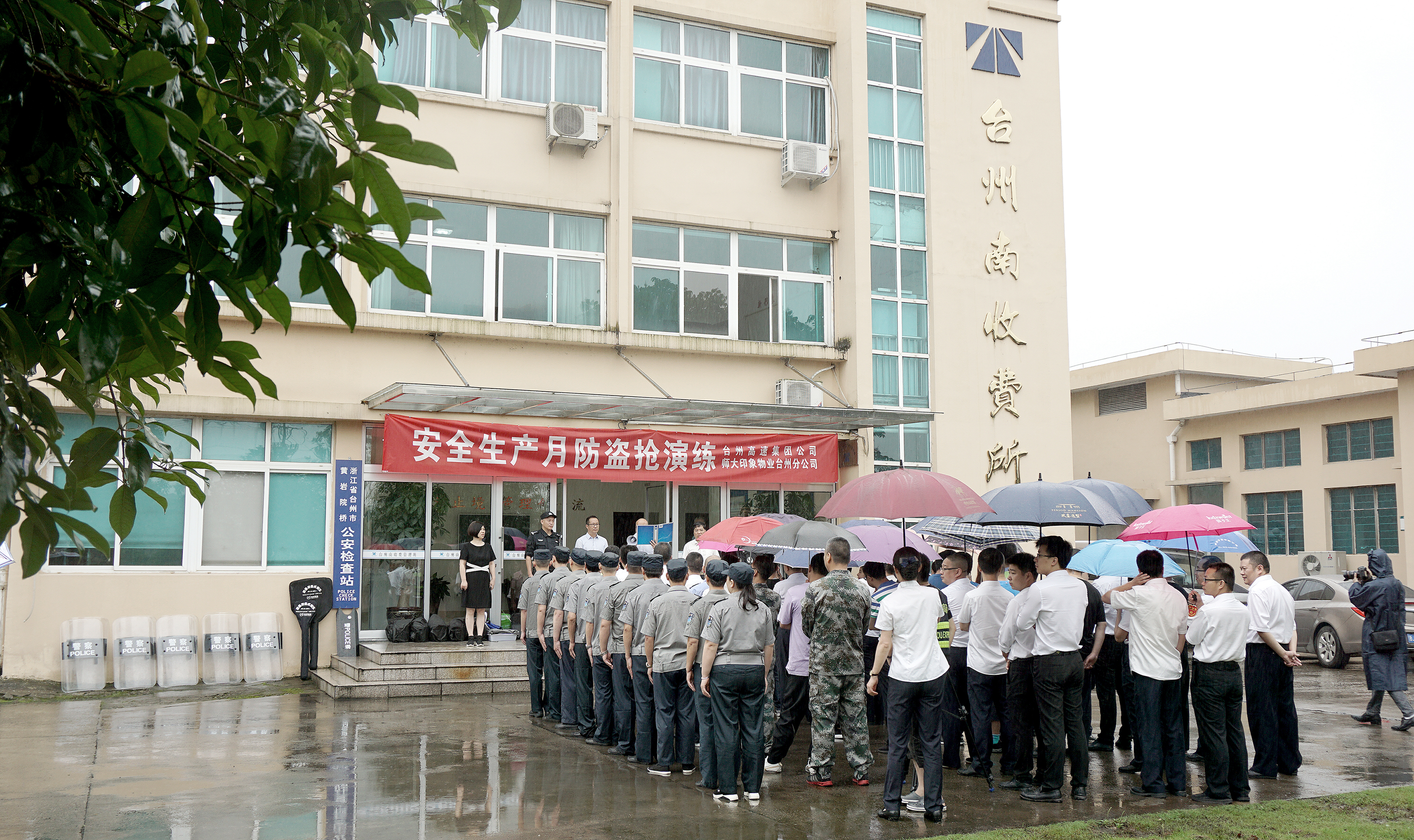 6月25日上午,臺州高速集團在臺州南收費所組織開展防盜搶應急演練活動。各所、中心、子公司以及浙師大印象物業臺州分公司相關人員參加活動。集團副總經理章海峰、安全總監項同富到場觀摩演練。