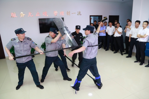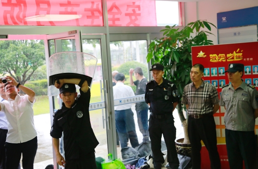 演練開始前,盧尚明對防爆盾牌、防爆鋼叉、抓捕器、警棍等各類防爆器材的功能和使用方法進行一一講解,并示范操作,以及帶領大樓浙師大印象物業人員現場練習器械使用。