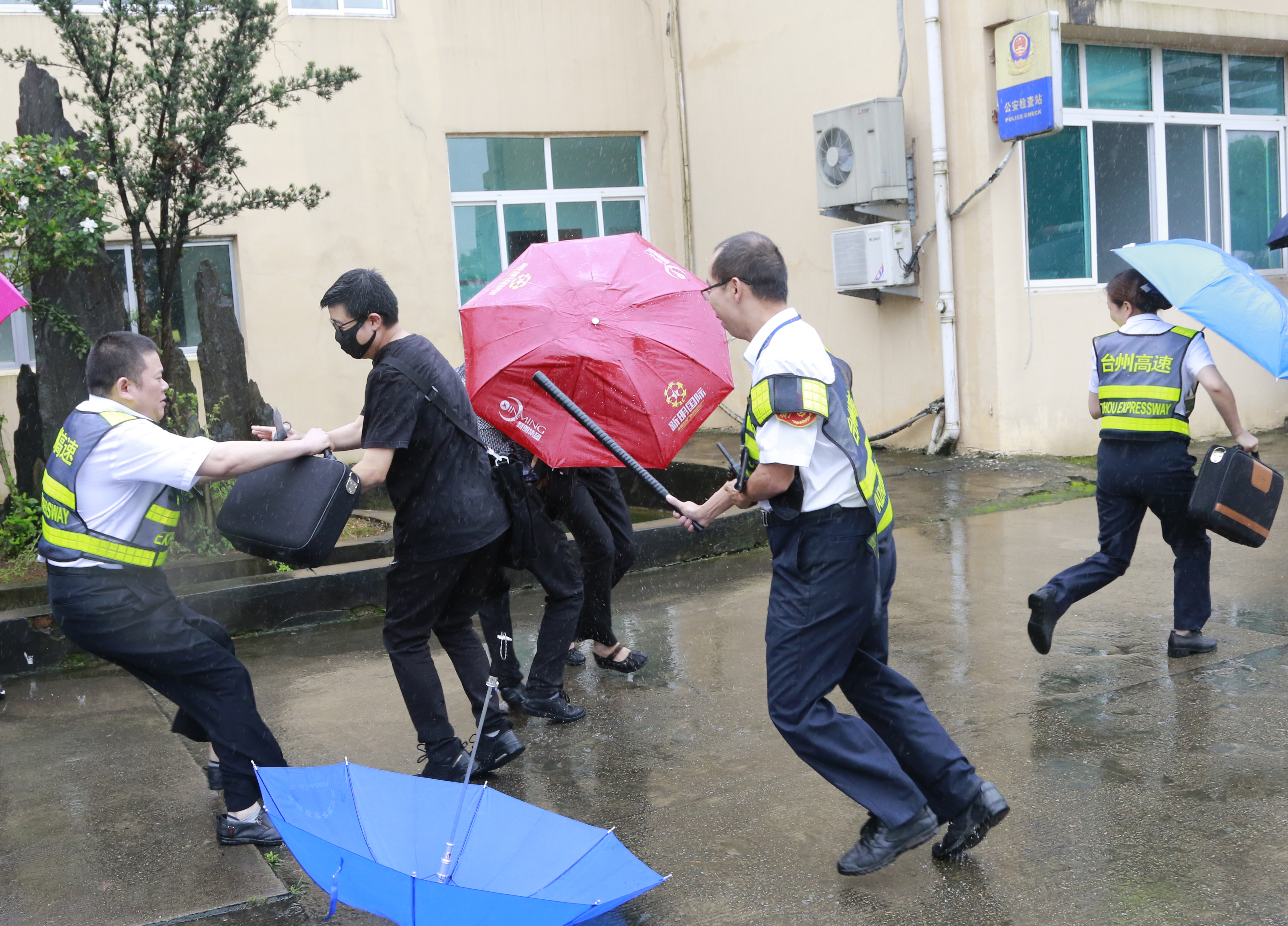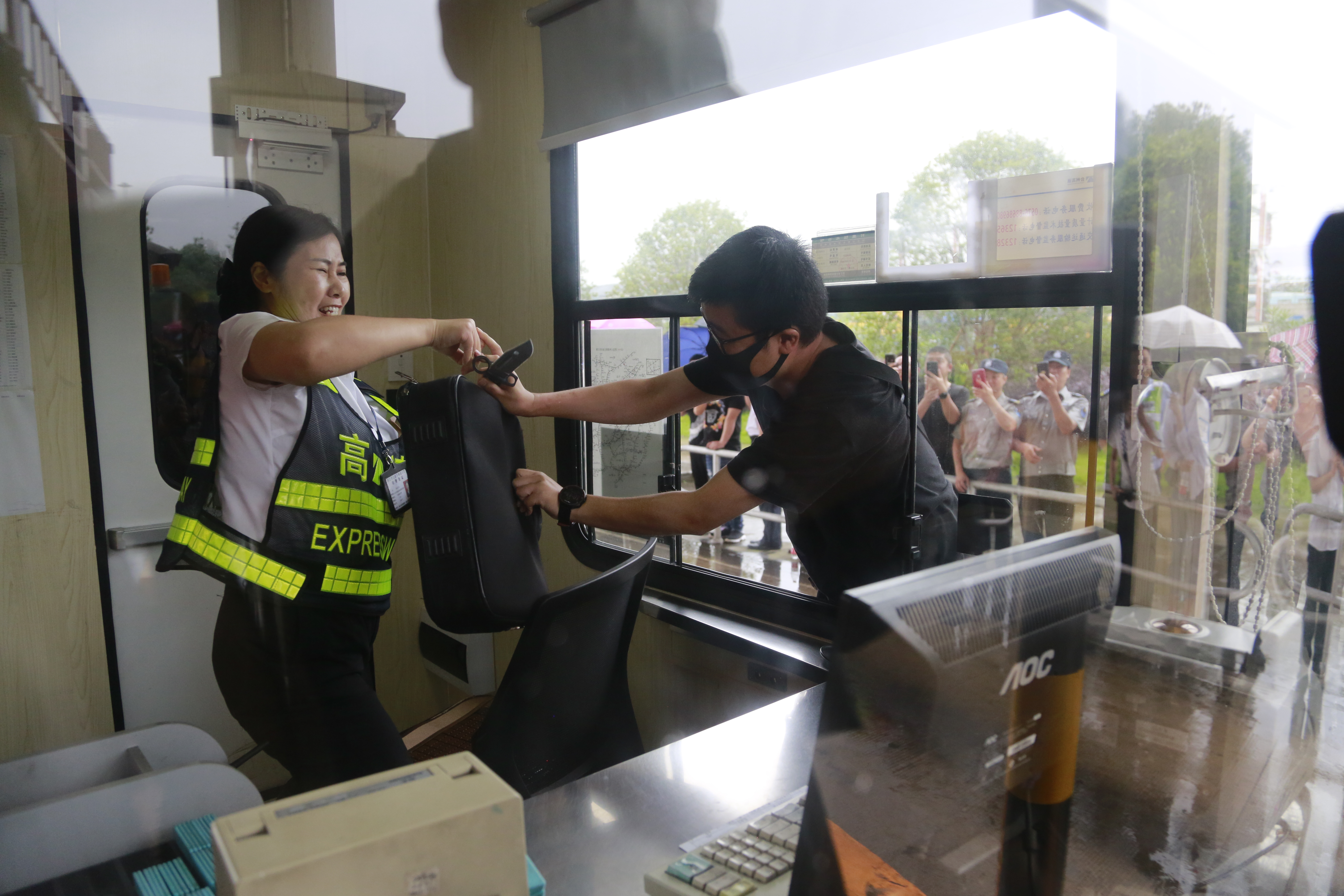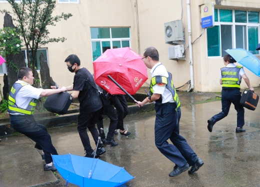 隨后,多名參演員工冒雨模擬收費崗亭和列隊下崗遭遇“歹徒”搶劫的情景開展防盜搶演練。現場,2名蒙面歹徒執仿真刀、軟棍威脅收費員交出現金,危機之中,收費站立即啟動應急處置預案并報警求助,收費員有效與歹徒周旋,應急處置組人員迅速攜鋼叉、橡膠棒、勞動工具等赴現場支援,值班領導、收費班長、監控員合力協作應對歹徒,防盜搶演練順利結束。