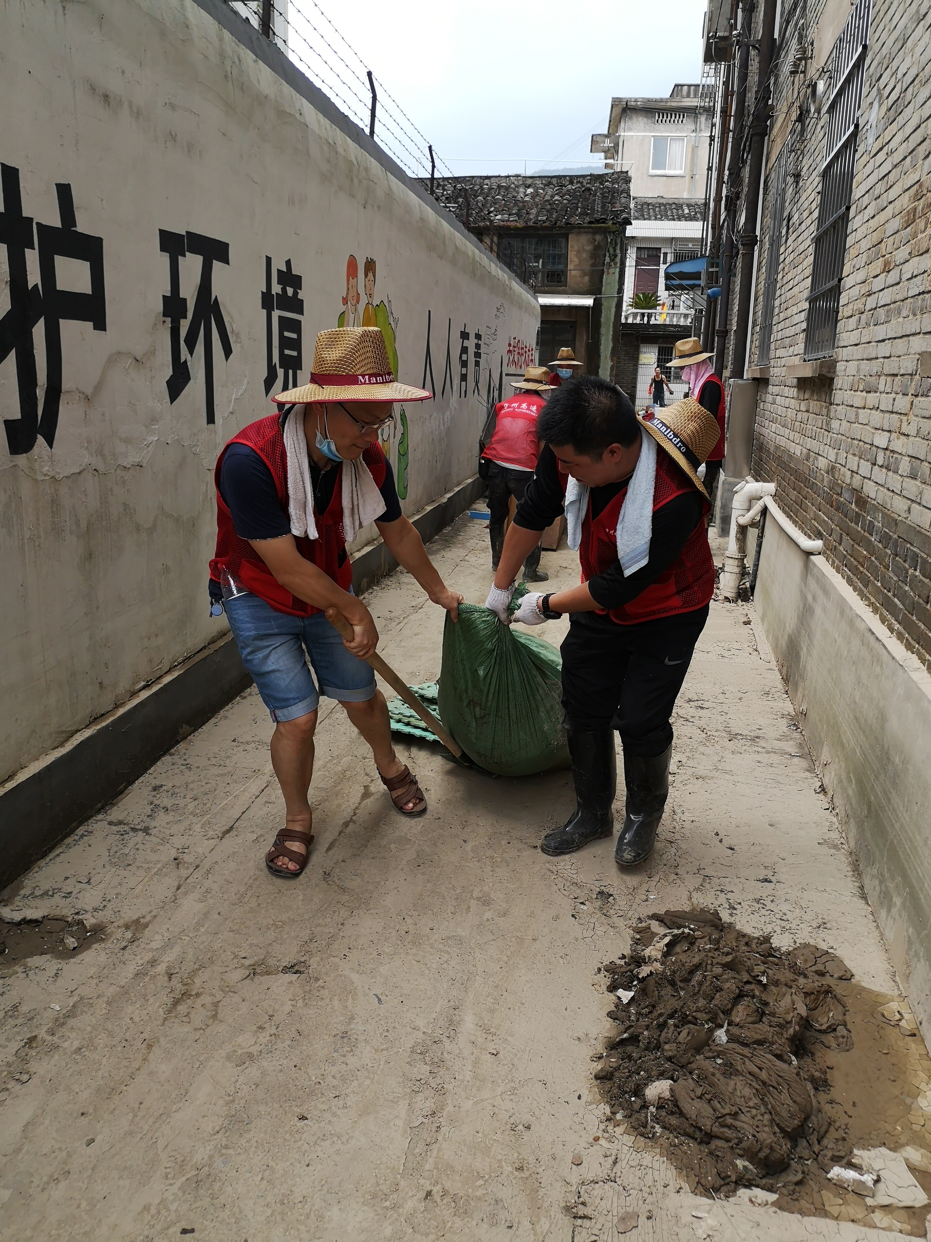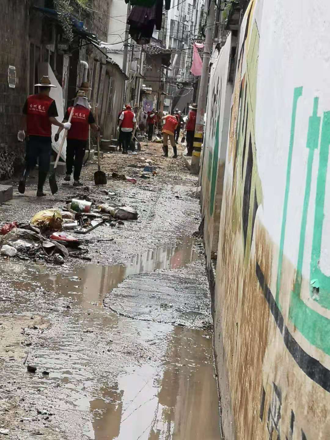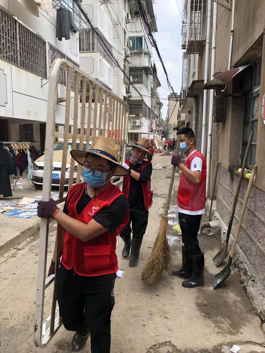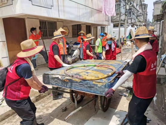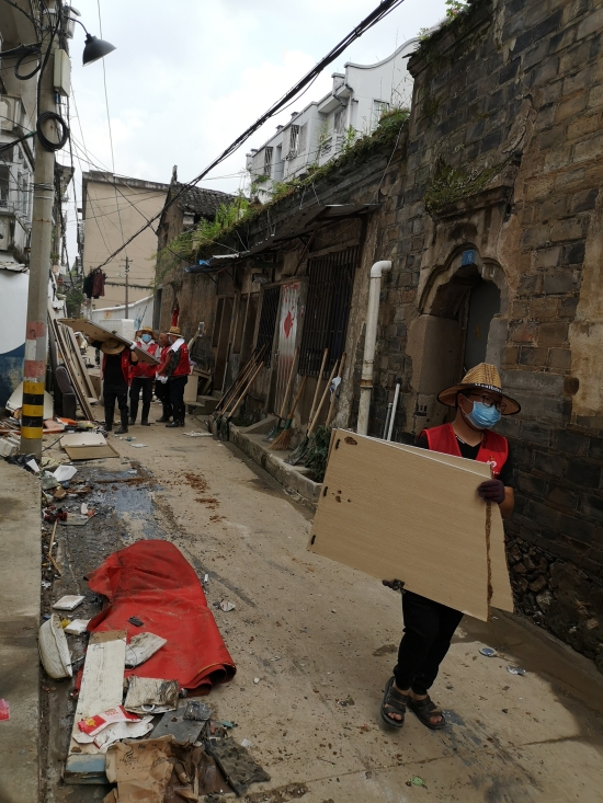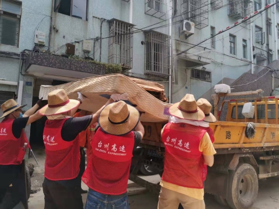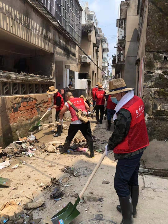 在臨海古城赤城路米篩巷,臺(tái)州高速集團(tuán)的志愿者們頂著毒辣的太陽(yáng),不怕臟不怕累,積極為災(zāi)后重建貢獻(xiàn)力量,清理路面淤泥、垃圾,保障路面清潔以及道路順暢。