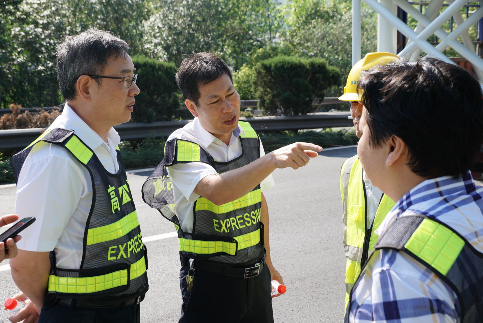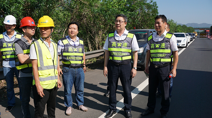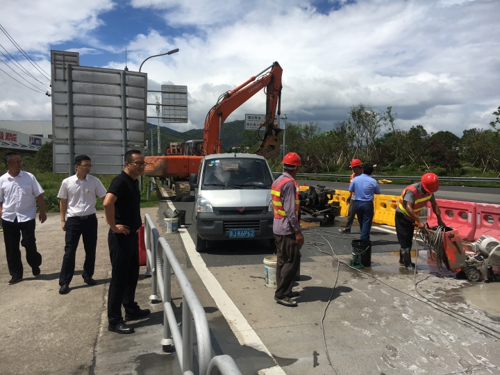 在甬臺溫高速公路臺州段溫州方向主線K1668+200M處現場,陳文波詳細了解龍門架吊裝的施工工序、取消省界收費站總體施工進展情況、項目時間節點、人員班組安排及安全措施準備情況等。