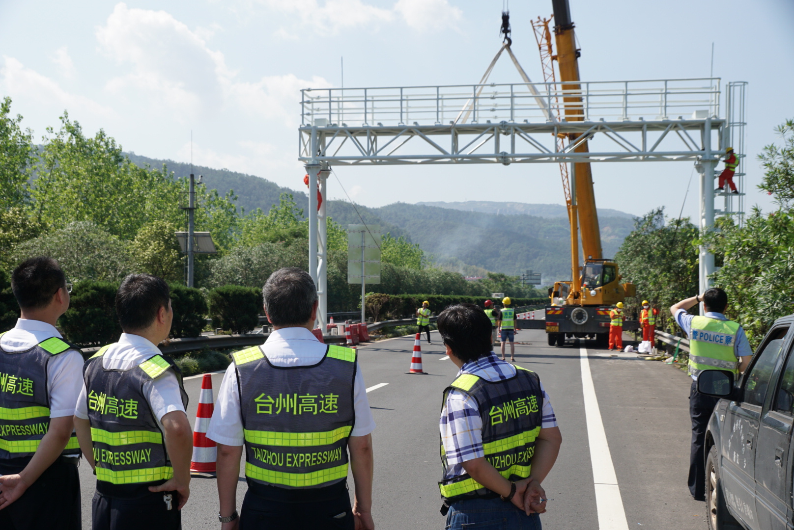 在吊裝過程中,施工現場只進行了短短十分鐘的交通斷流。隨著臺州高速取消省界收費站項目第一個主線龍門架吊裝完成,這也標志著此項工程進入了快車道。