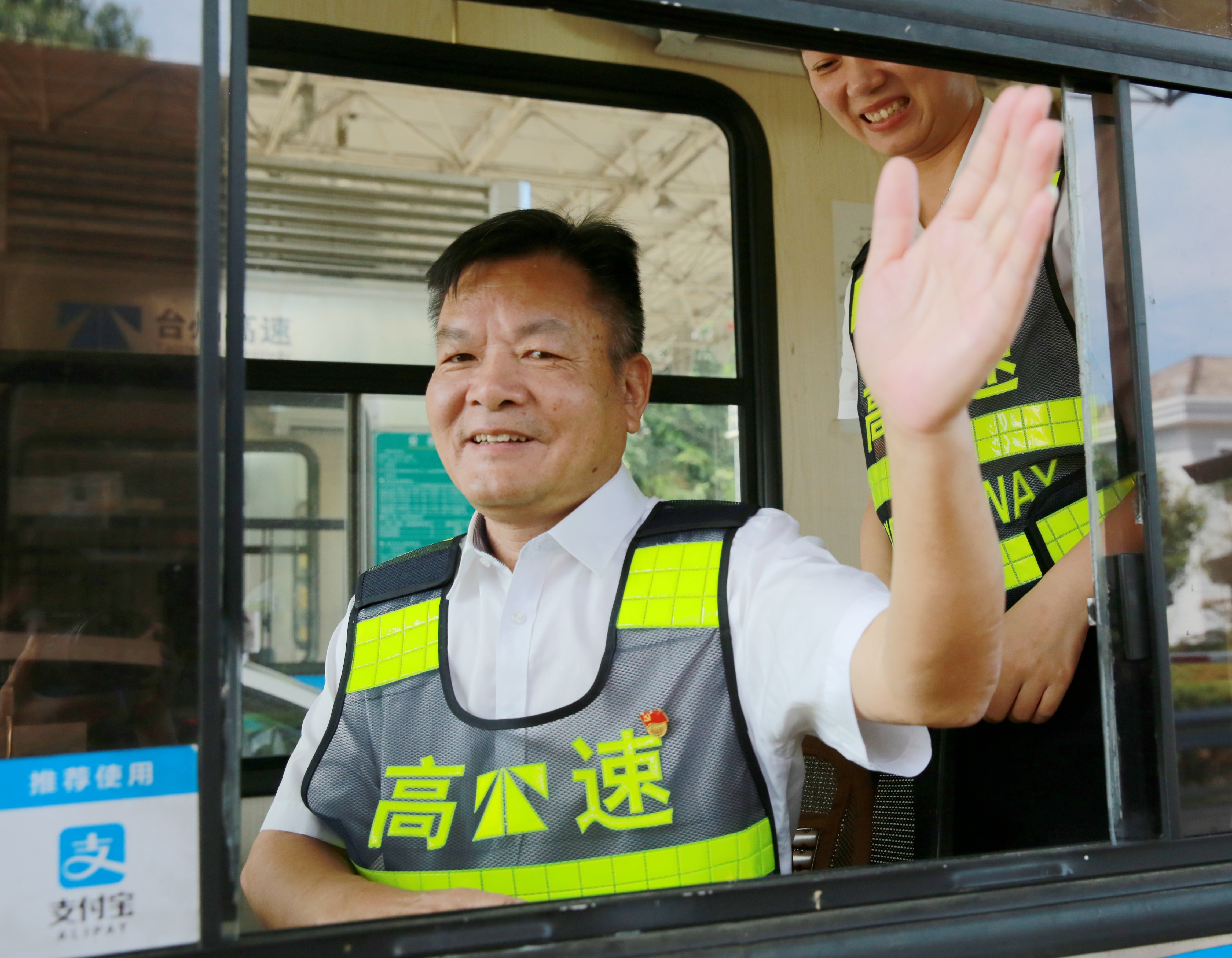 “我再試試,我這個微笑還標(biāo)準(zhǔn)嗎?”正在臨海南收費(fèi)所二號收費(fèi)崗?fù)だ锸召M(fèi)的集團(tuán)副總經(jīng)理陳保衛(wèi)認(rèn)真做著收費(fèi)的規(guī)范動作微笑示意。