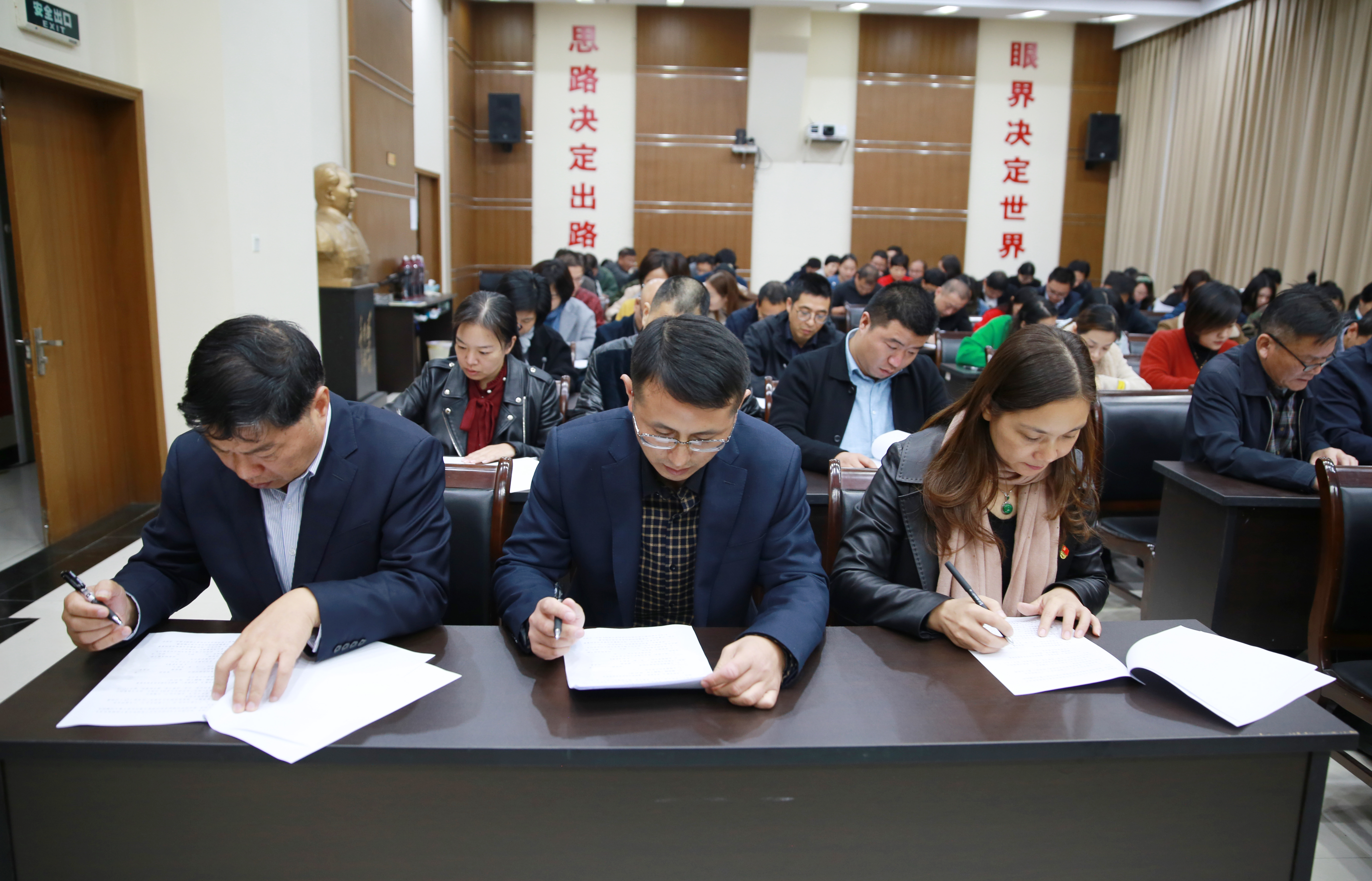 圖為測試現場 此次測試采取閉卷形式,分黨員和非黨員試題兩卷,測試范圍包括“不忘初心、牢記使命”主題教育、十九大報告及習近平新時代中國特色社會主義思想等知識。大樓近100名員工參加測試。 此次測試既是對學習效果的檢驗考核,又是對學習成果的鞏固提升,將進一步激發全體員工學習的主動性和積極性,使政治信念更加堅定、理論知識更加充沛、工作熱情更加高漲、行動更加積極務實,真正起到了以考促學、以考促記、以考促行的目的。大家紛紛表示要以此次知識測試為東風,鼓足干勁、學以致用,勇于擔當、忠誠履職,在平凡的崗位上干出優異成績,努力開創各項工作新局面。 馮曉潔