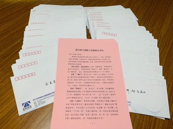 集團開展致全體干部職工家屬的公開信活動 6月18日,集團緊貼廉政教育月活動要求,將“致全體干部職工家屬的公開信”交到每一名職工手中,以這種家書形式廣泛宣傳廉潔清正的重要性,呼吁他們爭當反腐倡廉的“廉內助”。