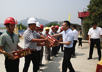 圖為公司副董事長、總經理張建平給一線人員送上消暑慰問品
