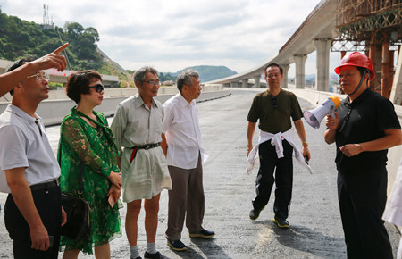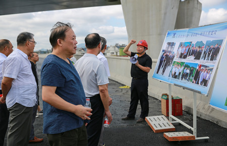 圖為在6#立交上了解工程建設情況 老干部一行實地踏勘了內環路(黃巖段)各施工現場,全面了解了四個標段工程當前建設情況。一路上,老干部們一面聽取各標段工作匯報,一面用手機相機記錄現場當前建設情況,當知道今年11月11日內環路將實現主線通車時,老干部們紛紛豎起大拇指,為內環路建設的進度和質量點贊,同時表示將多走多看,為內環建設盡自己的一份力。 鐘彪對老干部們的關心和支持表示衷心感謝,并希望各位老干部多指導、多監督、多提寶貴意見,助力臺州城市建設趕超發展。 張琛